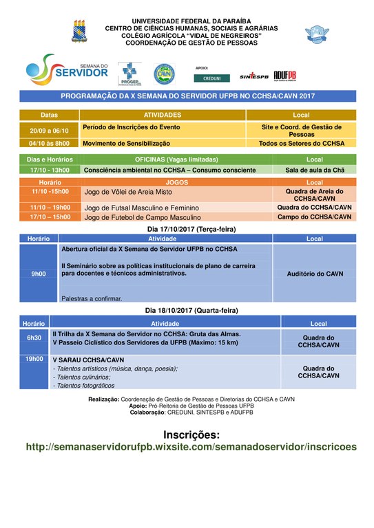 PROGRAMAÇÃO DA X SEMANA DO SERVIDOR UFPB NO CCHSA/CAVN 2017
