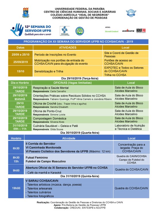 ATENÇÃO: Abertas as inscrições para a XII SEMANA DO SERVIDOR UFPB no CCHSA/CAVN