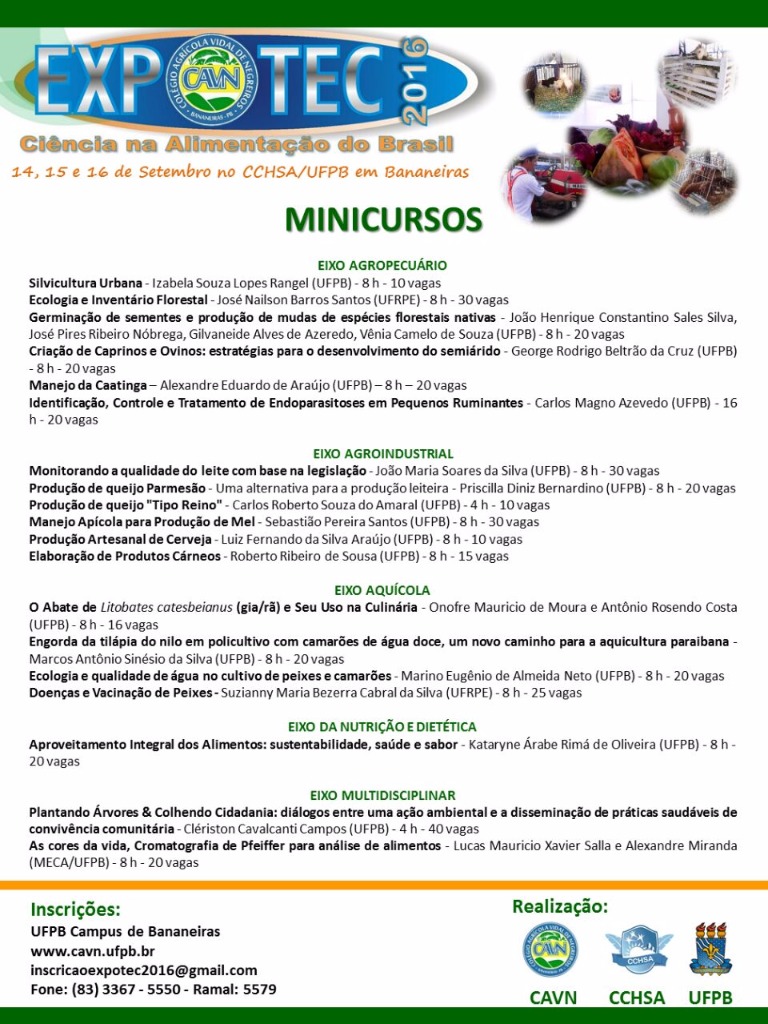 Além da Exposição propriamente dita, a comunidade em geral poderá participar de Minicursos e Oficinas. Para ver a programação dos Minicursos e Oficinas, clique aqui. As inscrições são feitas através do site do evento: http://aldasibarbosa.wix.com/expotec2016.