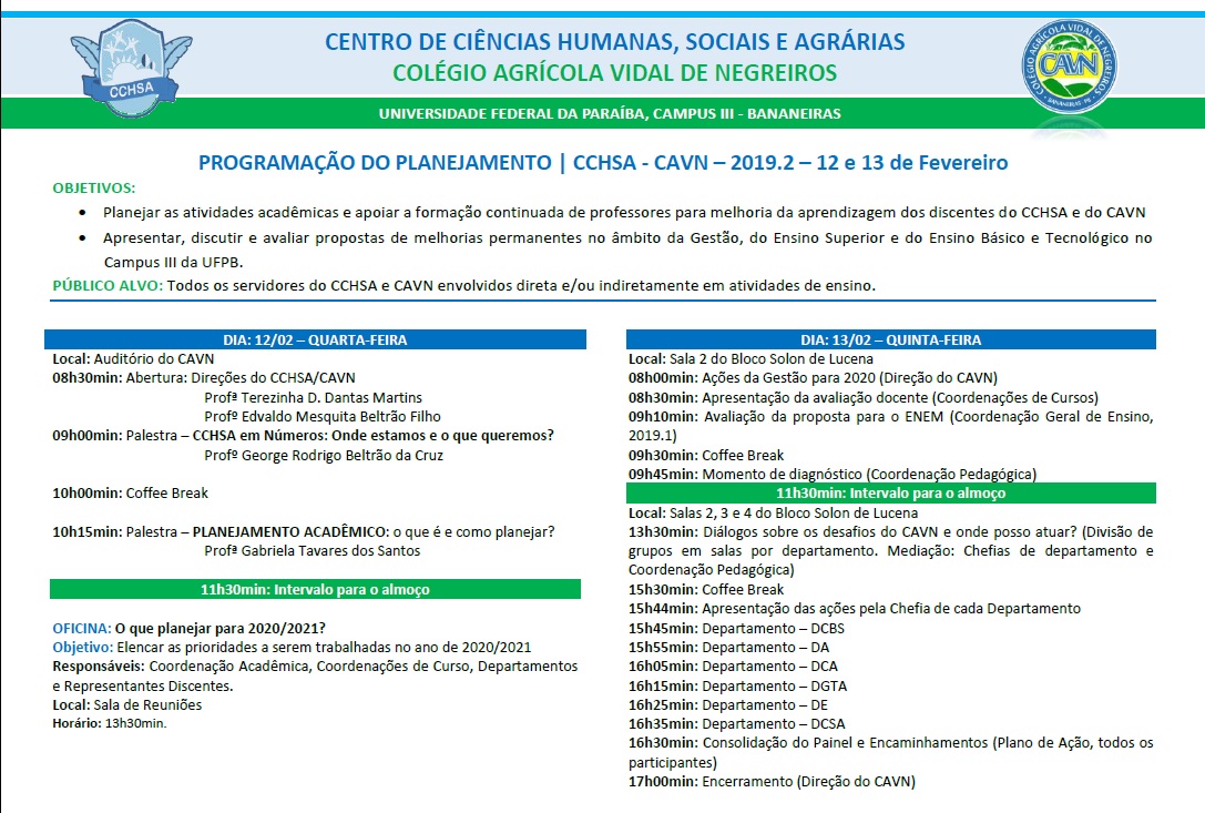 PROGRAMAÇÃO DO PLANEJAMENTO | CCHSA - CAVN – 2019.2 – 12 e 13 de Fevereiro
