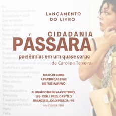 O livro Cidadania Pássara: poe(ê)mias em um quase corpo, de autoria da Profa. Dra. Carolina Teixeira - DAC/CCTA/UFPB, terá seu lançamento realizado em 05 de abril, a partir das 19h, no Bistrô Mariwó.