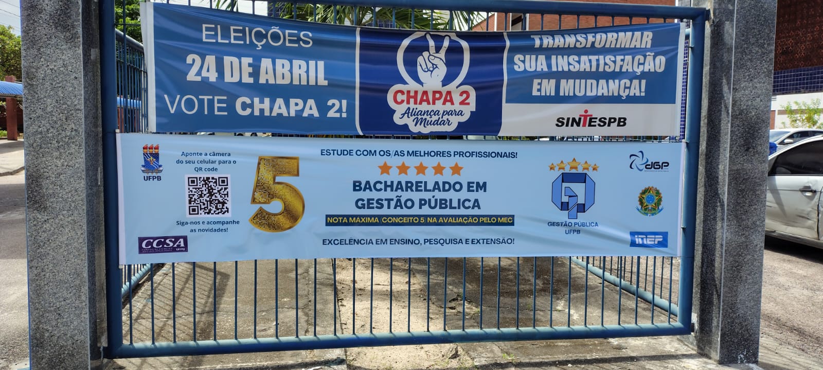 Nesta sexta-feira, 25/07, foi realizada a instalação das faixas alusivas ao Conceito Máximo (Nota 5) do curso de Bacharelado em Gestão Pública pelo Ministério da Educação (MEC), uma iniciativa e parceria entre o Departamento de Gestão Pública (DGP/CCSA) e a Coordenação do Bacharelado em Gestão Pública (CCGP/CCSA), do Centro de Ciências Sociais Aplicadas (CCSA) da Universidade Federal da Paraíba (UFPB)