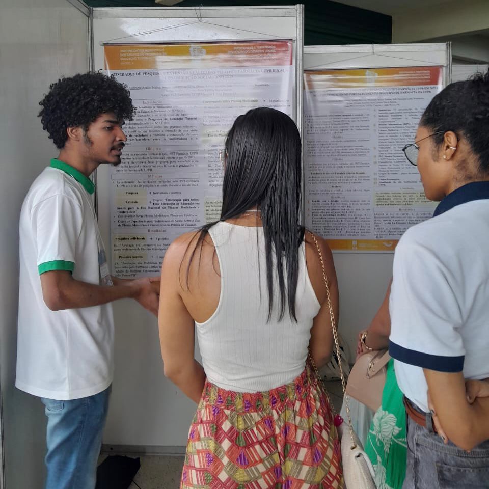 O PET- Farmácia participou do XI Encontro Unificado de Ensino, Pesquisa e Extensão da UFPB. No eixo do ensino foram apresentados os resumos intitulados: “Atividades de ensino desenvolvidas pelo PET-Farmácia UFPB em 2023 que fortaleceram a formação interdisciplinar dos bolsistas”; “Atividades de ensino desenvolvidas pelo PET-Farmácia que contribuem com a formação acadêmica e extracurricular dos estudantes de graduação em Farmácia da UFPB” e “Atividades de ensino desenvolvidas pelo PET-Farmácia UFPB e sua contribuição para a qualificação técnico-científica e cidadã dos bolsistas e discentes do curso de Farmácia”. No eixo da extensão foram apresentados os trabalhos: “Conversando sobre plantas medicinais: Planta em evidência, ano II” e “Curso de capacitação para profissionais de saúde sobre o uso de plantas medicinais e fitoterápicos na prática do cuidado”. Além disso, a equipe PET-Farmácia participou do evento destinado aos grupos PET UFPB e prestigiou a mesa redonda intitulada "As ações do PET para o desenvolvimento sustentável"
