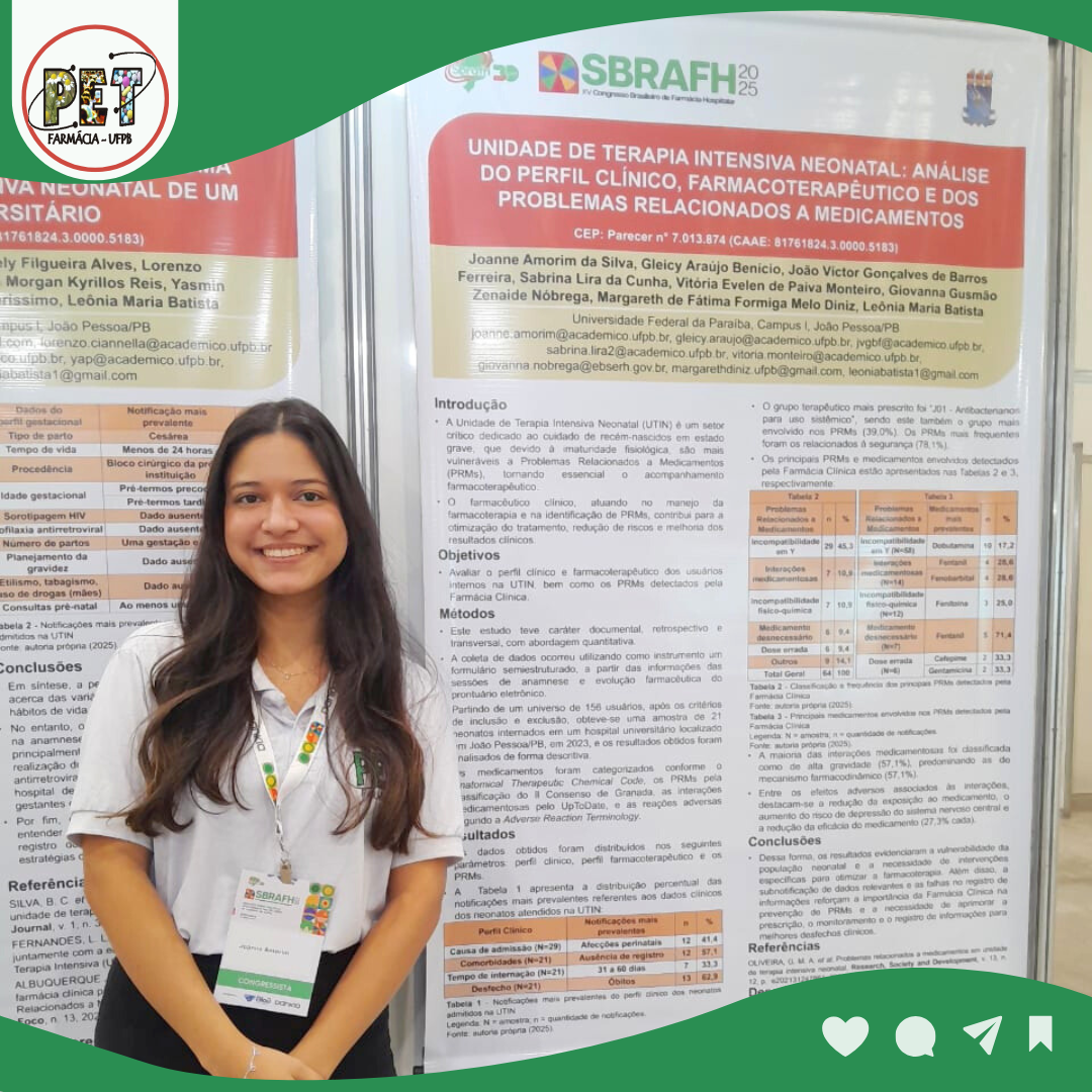 O programa esteve presente no dia 23/05/2025 no XV Congresso Brasileiro de Farmácia Hospitalar, organizado pela Sociedade Brasileira de Farmácia Hospitalar e Serviços de Saúde (SBRAFH), com a exposição dos trabalhos intitulados "Avaliação do Perfil Sociodemográfico e Gestacional de Neonatos Admitidos em uma Unidade de Terapia Intensiva Neonatal de um Hospital Universitário" e "Unidade de Terapia Intensiva Neonatal: Análise do Perfil Clínico, Farmacoterapêutico e dos Problemas Relacionados a Medicamentos".