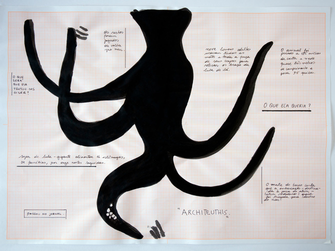 Título: Architeuthis (série Avistamento); Data: 2020; Técnica: Nanquim sobre papel milimetrado; Dimensões: 42x30 cm; Doação da Artista