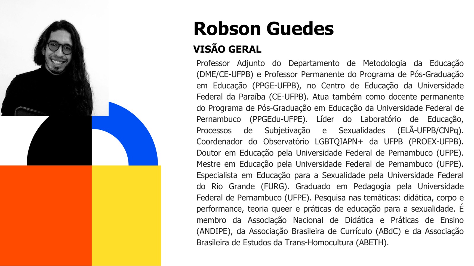 - Áreas de Interesse: Educação das relações étnico-raciais; raça e suas interseccionalidades; Pedagogias anticoloniais, de(s)coloniais e contracoloniais; Descolonização curricular; Movimento Negro educador. Antirracismo e formação docente. Leis 10.639/03 e 11.645/08.